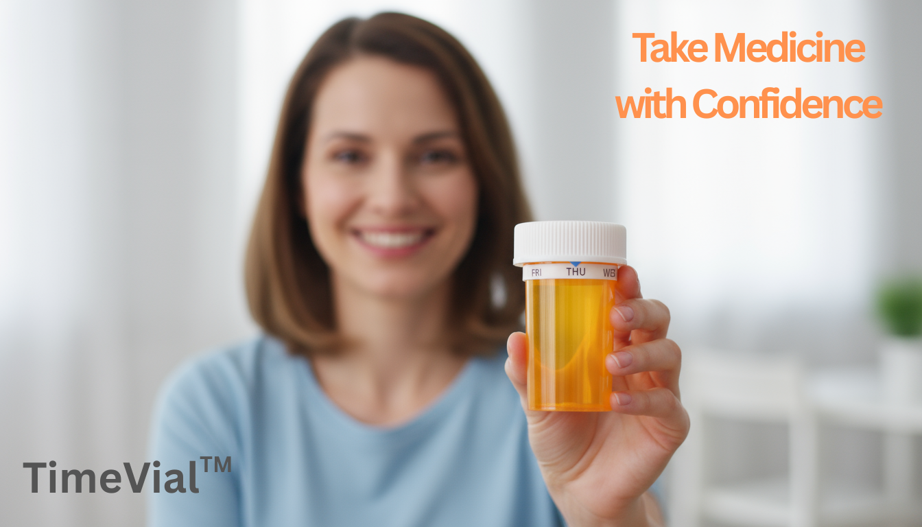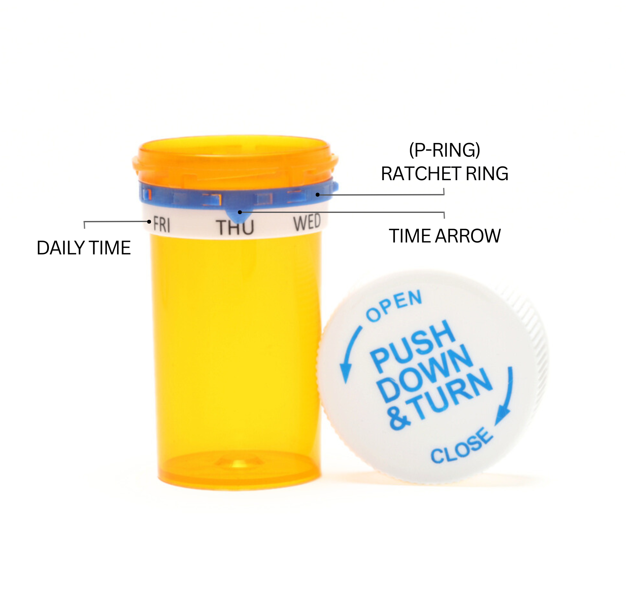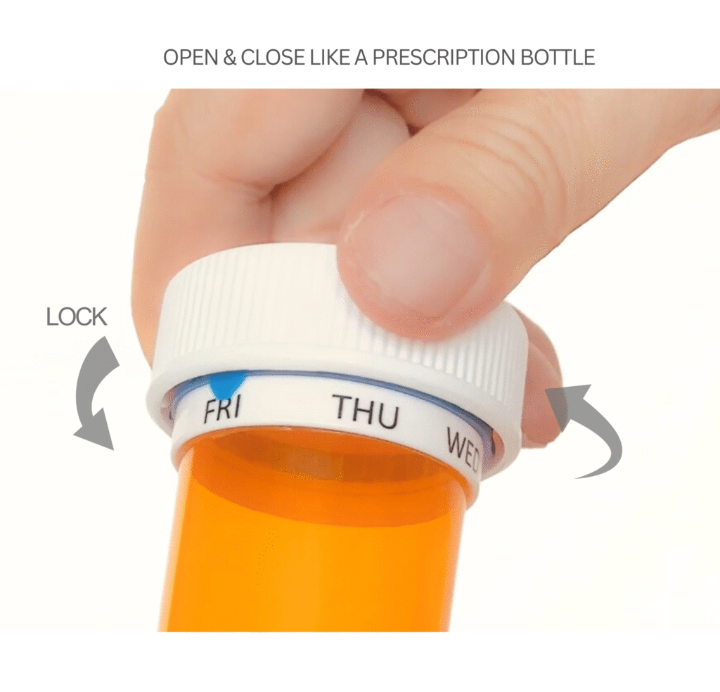 Lock cap = mark the date: TimeVial pill bottle has a built-in daily reminder with an arrow that automatically moves to the next day of the week when the bottle is opened and fully closed. No buttons, no batteries, no apps – just a clever mechanical tracker.
