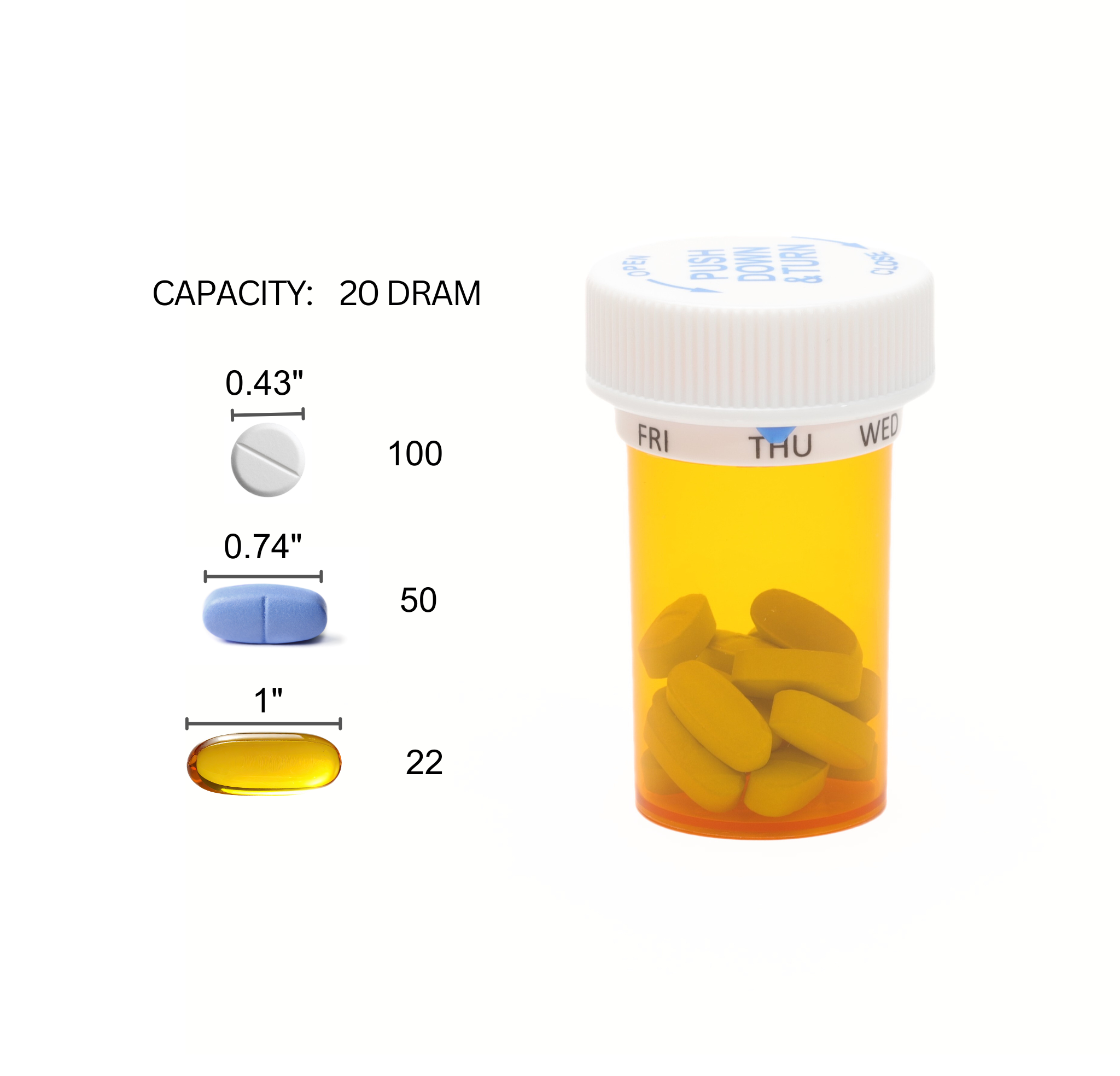 The pill bottle has a size of ~2 × 2 × 3.2 inches and a 20-dram capacity, accommodating approximately 40–50 multivitamins, 22 fish oil or 100 aspirin tablets